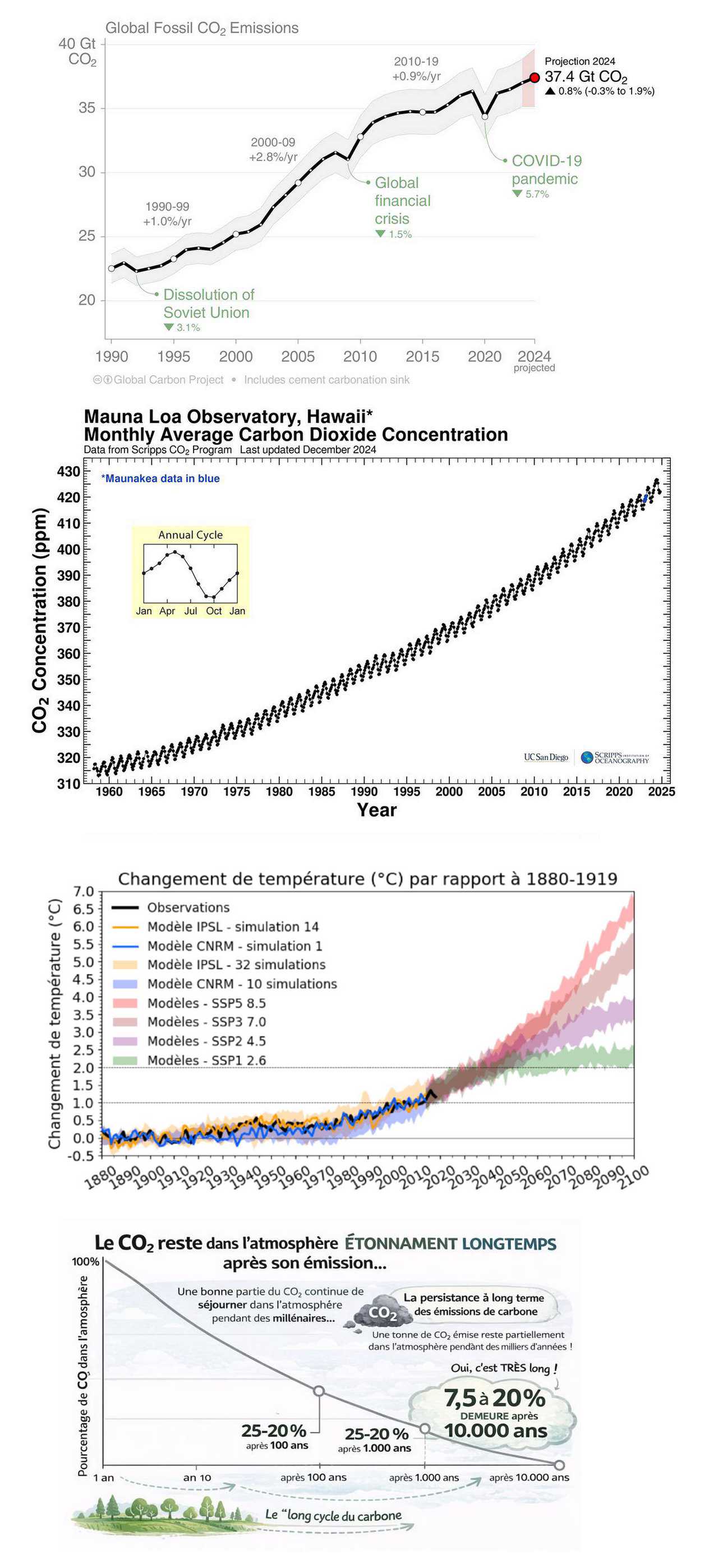 Ensuite la mesure de la température mondiale jusqu'à aujourd'hui et différents calculs de projection vers l'avenir jusqu'à 2100